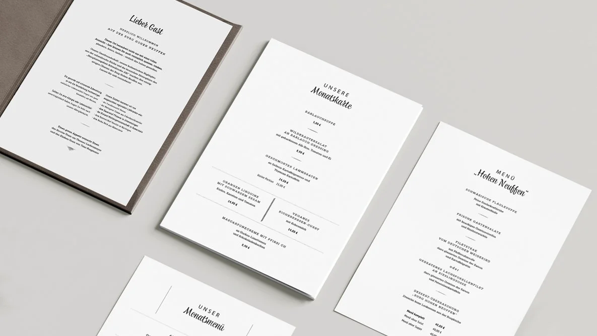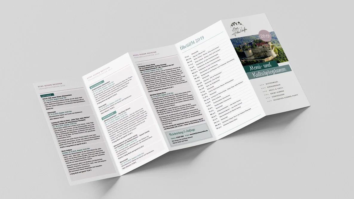Das Burgrestaurant Hohen Neuffen erlebte einen Generationenwechsel, der für einige Änderungen im Brand Design sorgte. Ich wurde beauftragt Kulturprogramme, Speisekarten, Flyer und Firmenmappen zu überarbeiten oder neu zu gestalten.