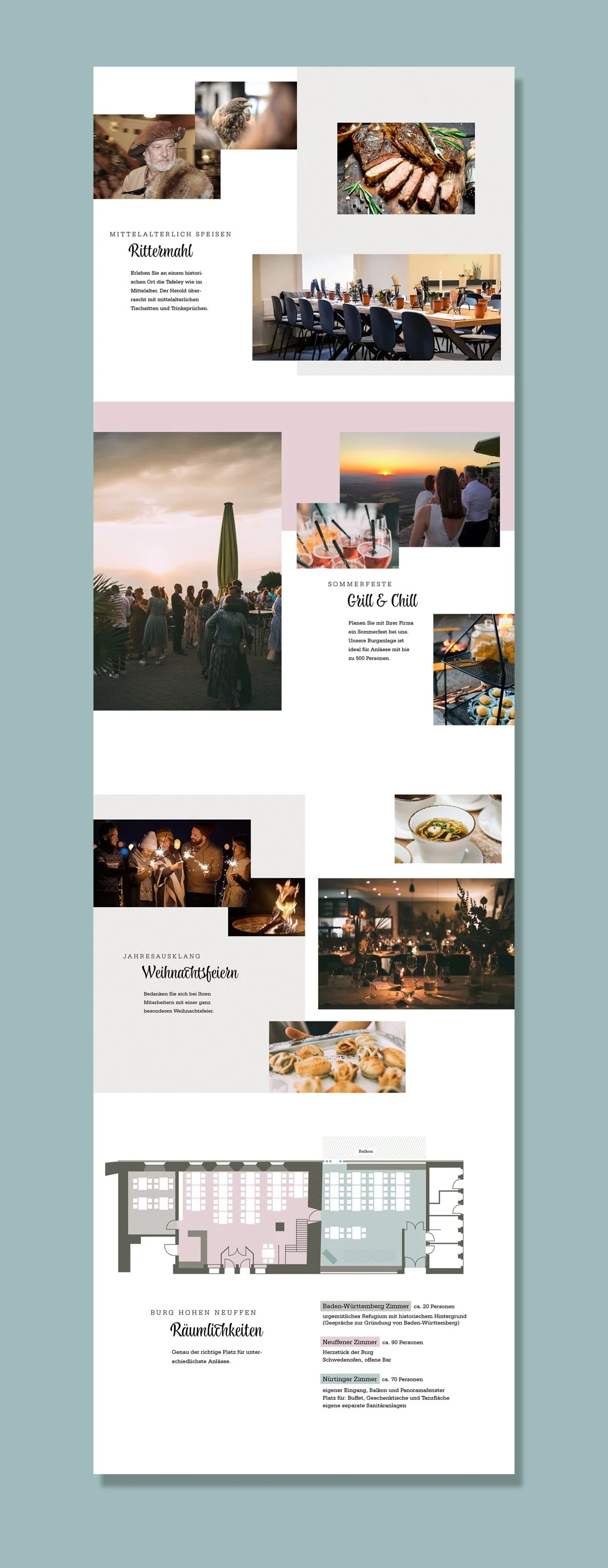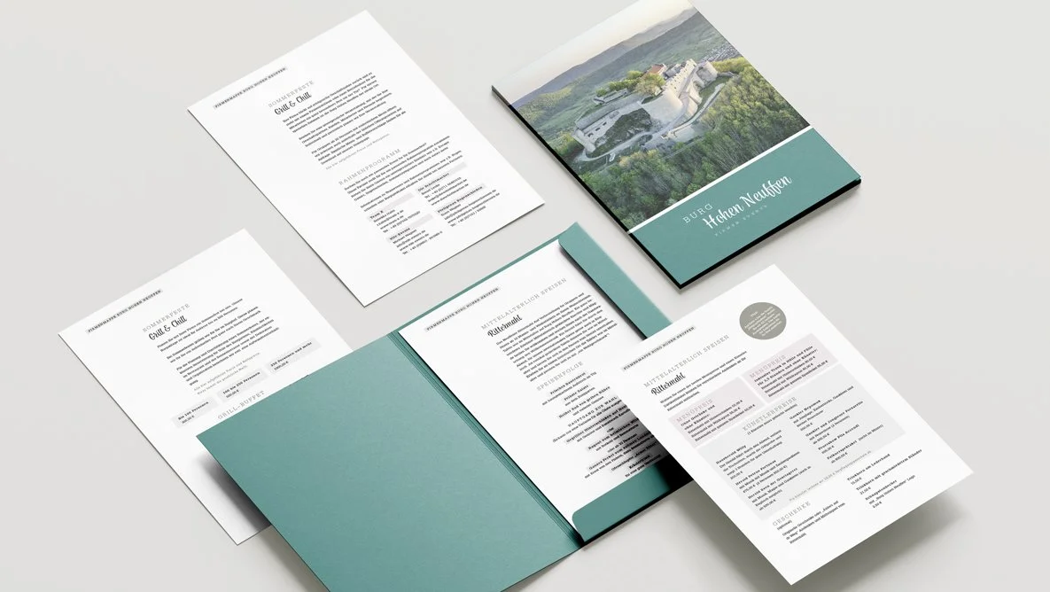 Die bisherige Farbpalette wurden durch die Farben Petrol, Graubraun und Altrosa abgelöst. Die verwendeten Schriften wirken edel und verspielt und passen zur Burg Hohen Neuffen als Location für Hochzeiten, Firmenevents, sowie für den Familienausflug.